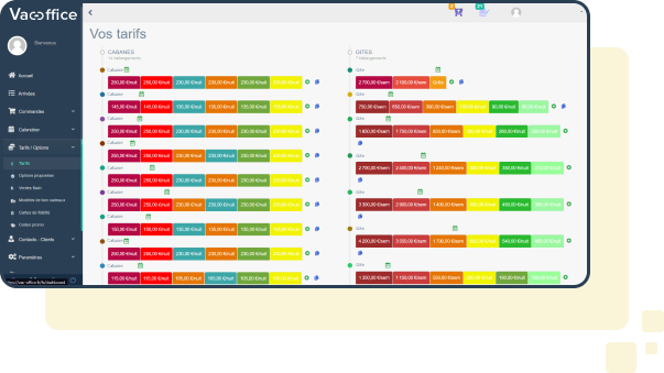 Vac-Office se positionne comme l'outil idéal pour optimiser le taux de remplissage de votre structure en vous permettant de paramétrer finement vos tarifs. Avec ses fonctionnalités avancées, vous pouvez définir des réductions liées à la durée du séjour, ajuster vos prix en fonction des périodes de forte ou de faible affluence, et ainsi maximiser vos réservations.